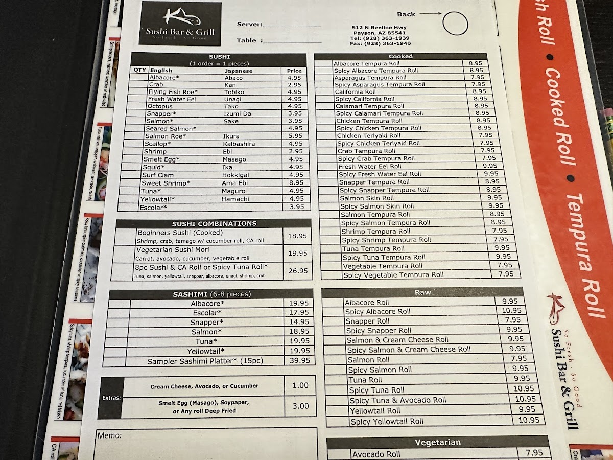 When you step into K Sushi Bar And Grill - Payson, AZ Menu, you're in for a treat. Located at 512 N Beeline Hwy in Payson, this cozy spot blends traditional flavors with a modern twist. Whether you're in the mood for fresh sushi or something off the grill, the menu has something for everyone. Start with some mouthwatering appetizers like crispy gyoza or a savory miso soup, perfect to tease your appetite. For the main course, dive into a variety of sushi rolls, from classic favorites like the California Roll to more adventurous options like the Dragon Roll. If sushi isn't your thing, the grill menu features flavorful dishes like tender teriyaki chicken or perfectly grilled steaks, all prepared with the finest ingredients. The warm, welcoming atmosphere makes it an ideal place for a casual meal with friends or family. The diverse menu is sure to satisfy any craving, so take your time exploring all the delicious choices available.
